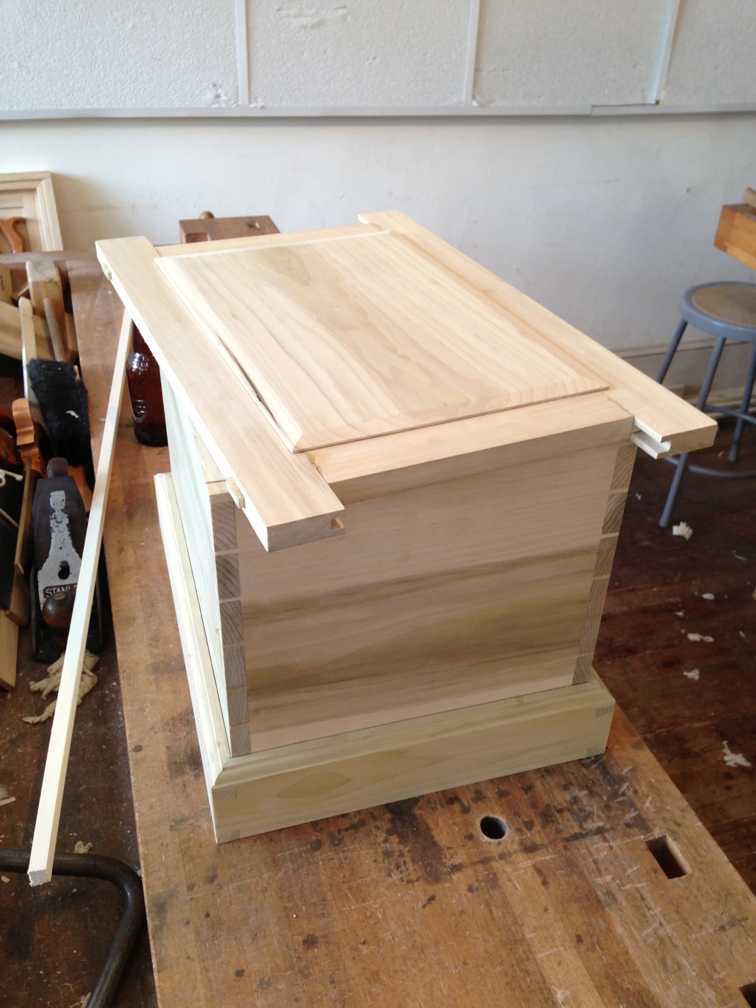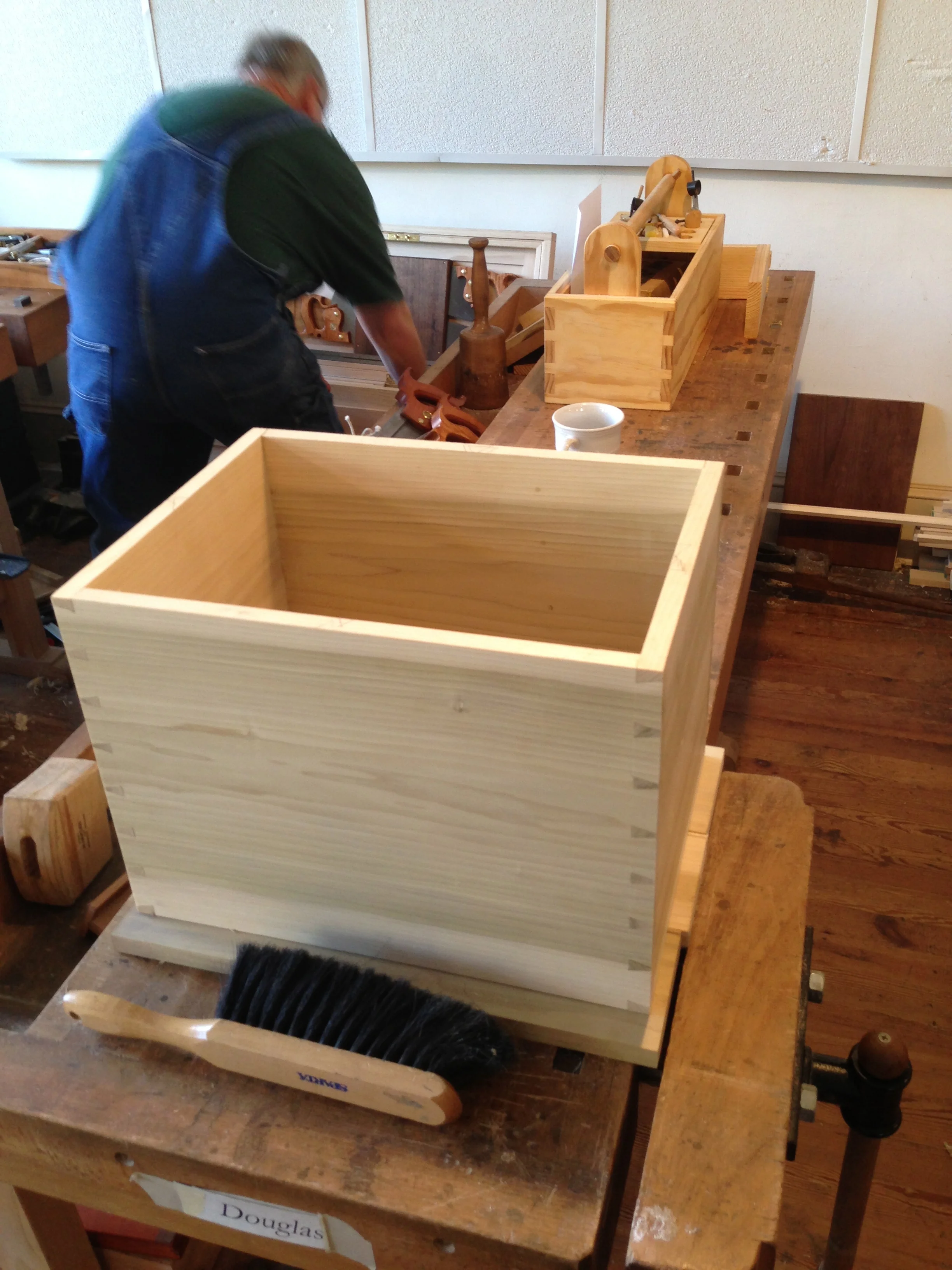 The project we were working on was a traditional joiner's benchtop tool chest, designed by Bill. The process of building the box took us through layout and straightening of stock (but not flattening), through dovetails, mitered dovetail corners, and frame and panel with mortise and tenon joints. We worked with simple poplar, as the project is intended to get a coat of paint at the end.