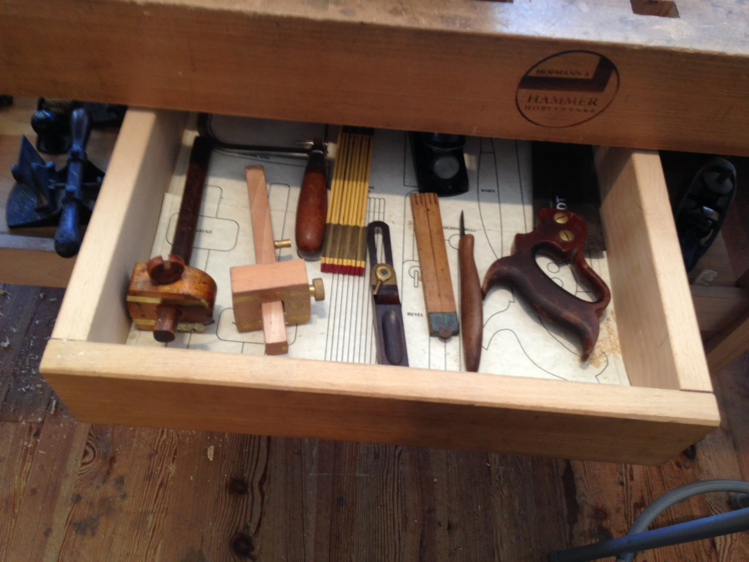 Another great thing about the class was tools, tools, tools. The school provided everything we could ever want, all in good shape and sharp. We were encouraged to bring our own tools if we desired, and I brought my tote with quite a few. In addition, Ed's toolstore, which is almost like a hand tool museum with pricetags, was just upstairs. Ed was more than generous, letting us take anything we liked down to the school to use during the class, to try them out. It was tool heaven. If that wasn't enough, my bench neighbor Ted brought an awesome full sized tool chest, stocked with all sorts of Lie-Nielson tool goodies, and was not only glad to share, but kept "tempting" me by leaning over with a "try this...", and I gladly accepted each offer!