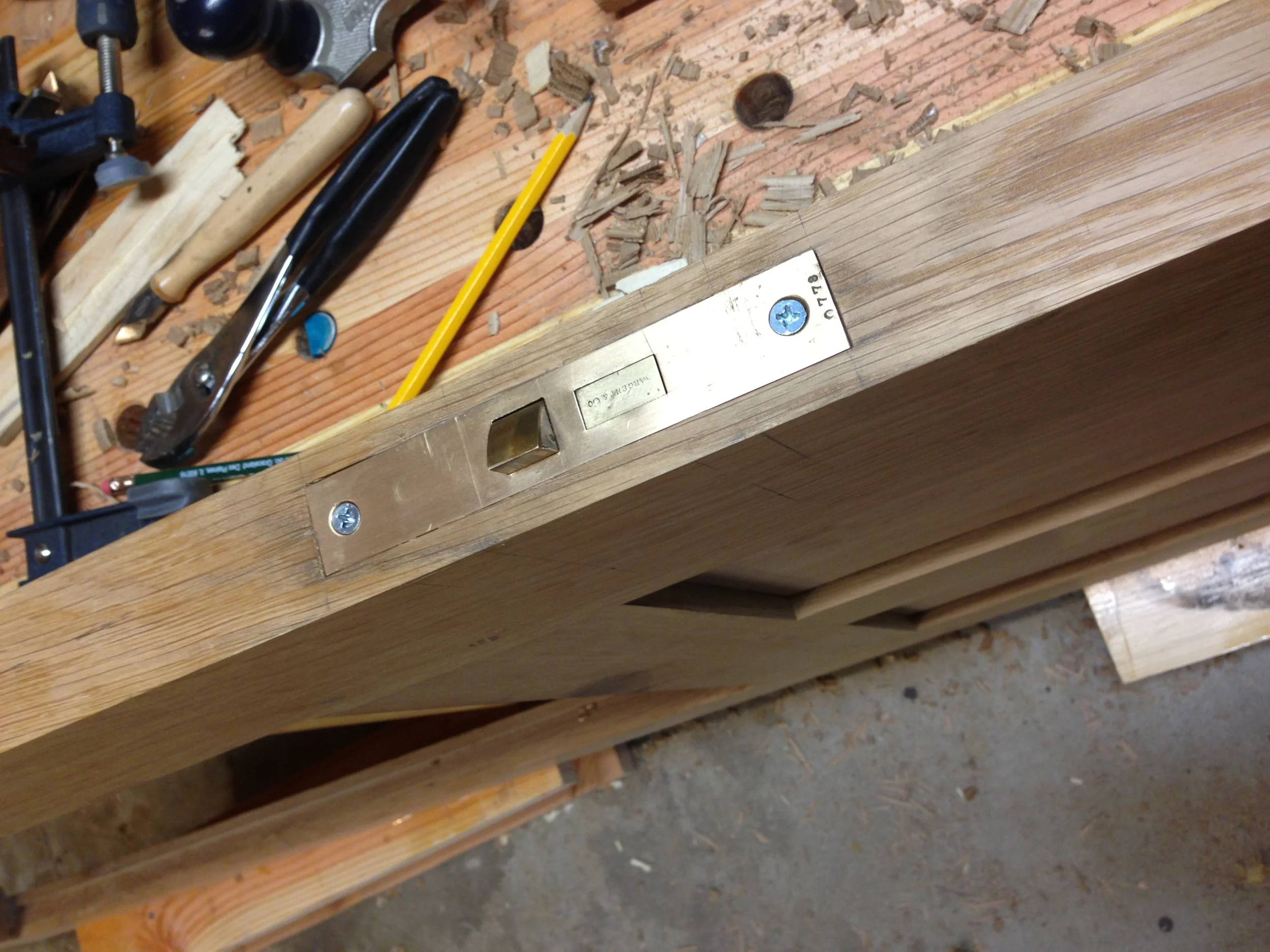 Almost done. Since part 2, the door was mortised for the vintage mortise lock. Yes, I'm going to be getting into and out of the house with a skeleton key (actually, two; the original mortise lock on the front door is getting skeleton keys made for it too). THe mortising went great, and I opted to do it by hand, as it was just easier that fiddling around with a router setup. Sharp chisels and a router plane made the work go smoothly and resulted in a perfect fit.