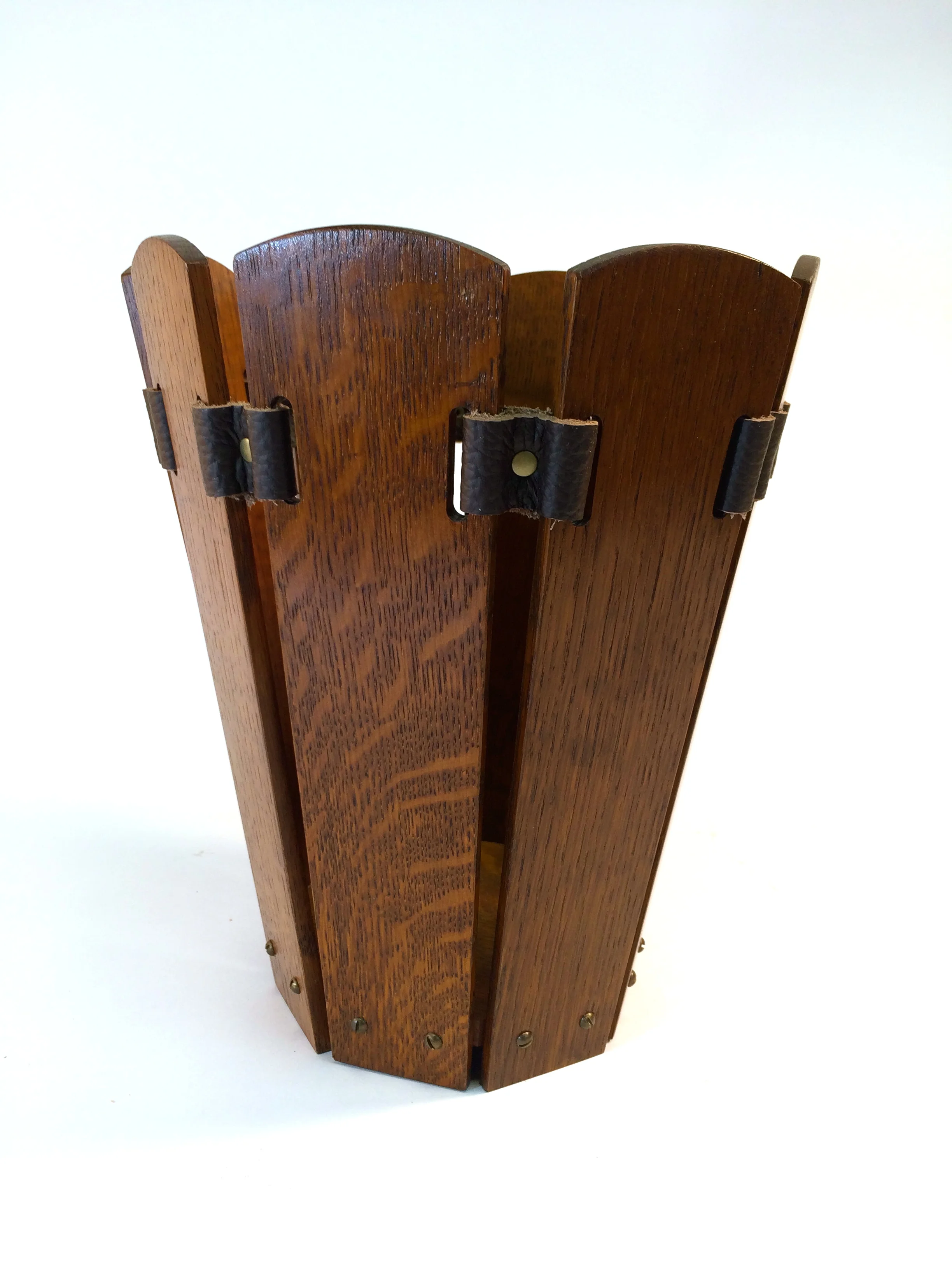After the build, and with much pleasure, I relegated the plastic garbage cans to the basement, and placed the four news ones throughout the house. The brass clip version of the "leaves" one is in my office, where I don't mind the flaws very much. The only thing I might add to these, especially to the large "slats" one, is a copper liner, so that a) messier things could be put in it, and b) one would only have to empty the liner, rather than picking up the whole thing. I'd like to try making the liner with folded sheets of copper (copper roof flashing?) and a soldered weld. I've never done that before, but I look forward to figuring that out.