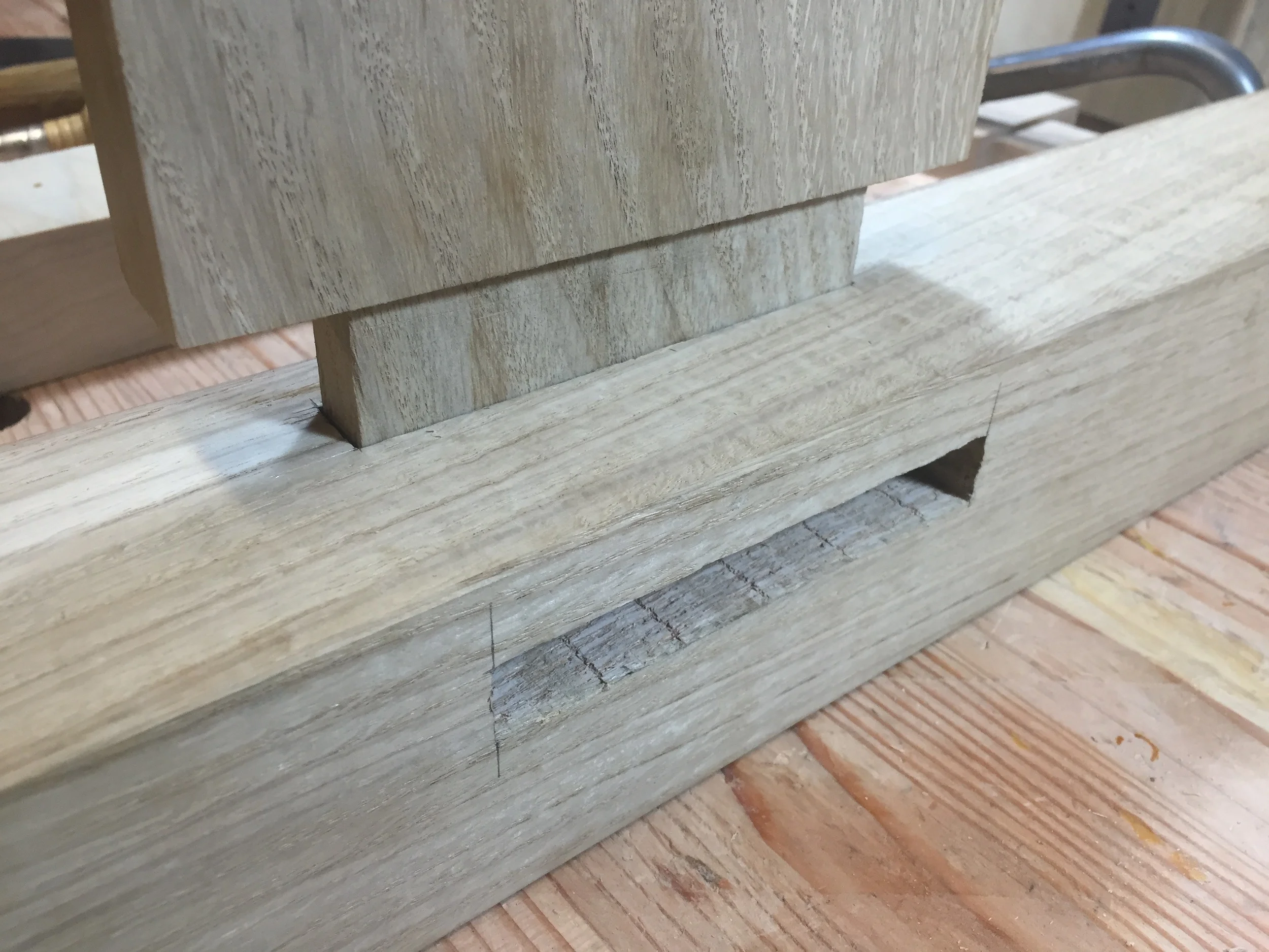 top view of a rear leg, showing the two tenons meeting on the inside.