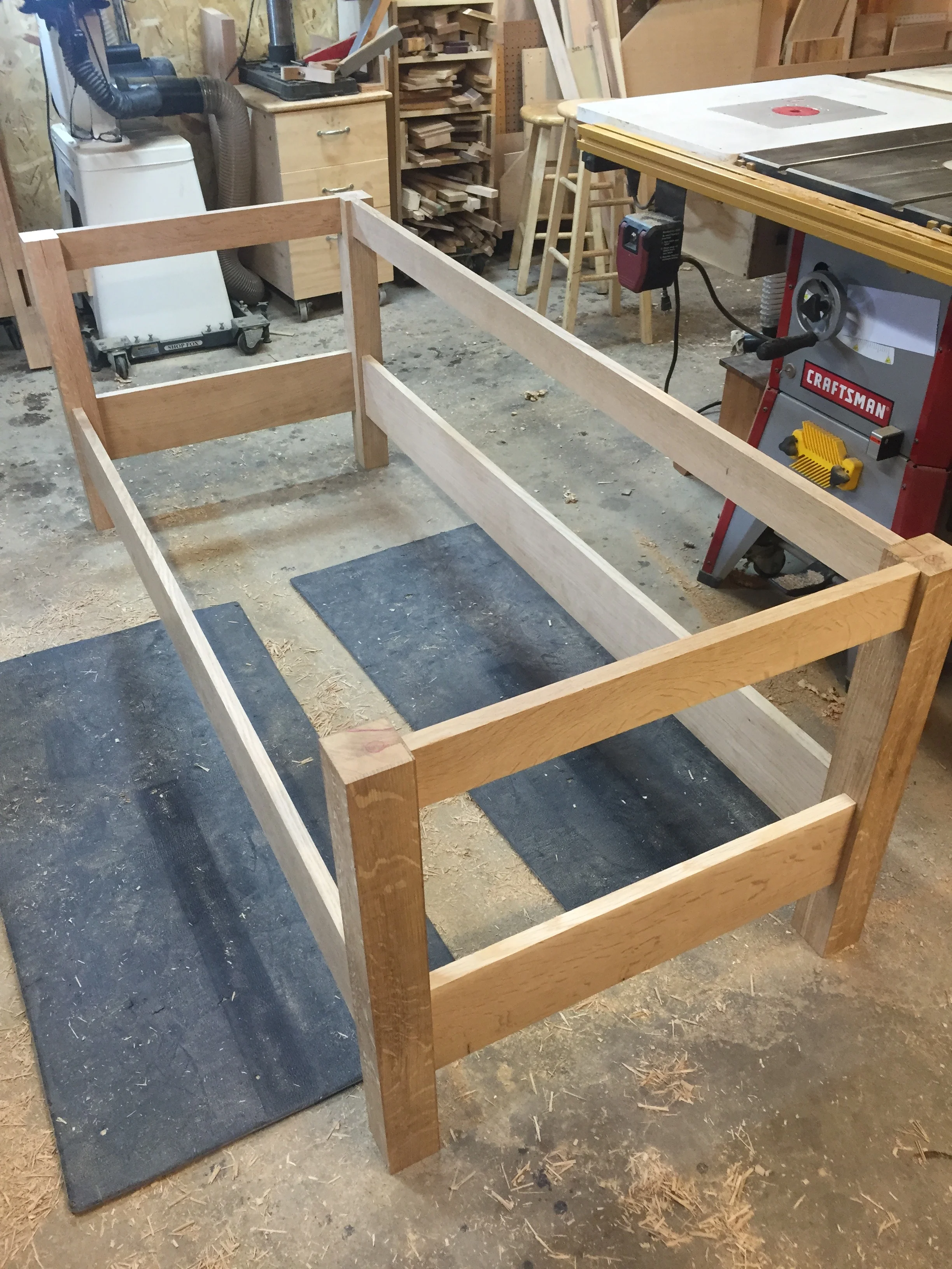Test build of the "spindles" sides, with a decorative cutout slat in the middle, which I later ditched.