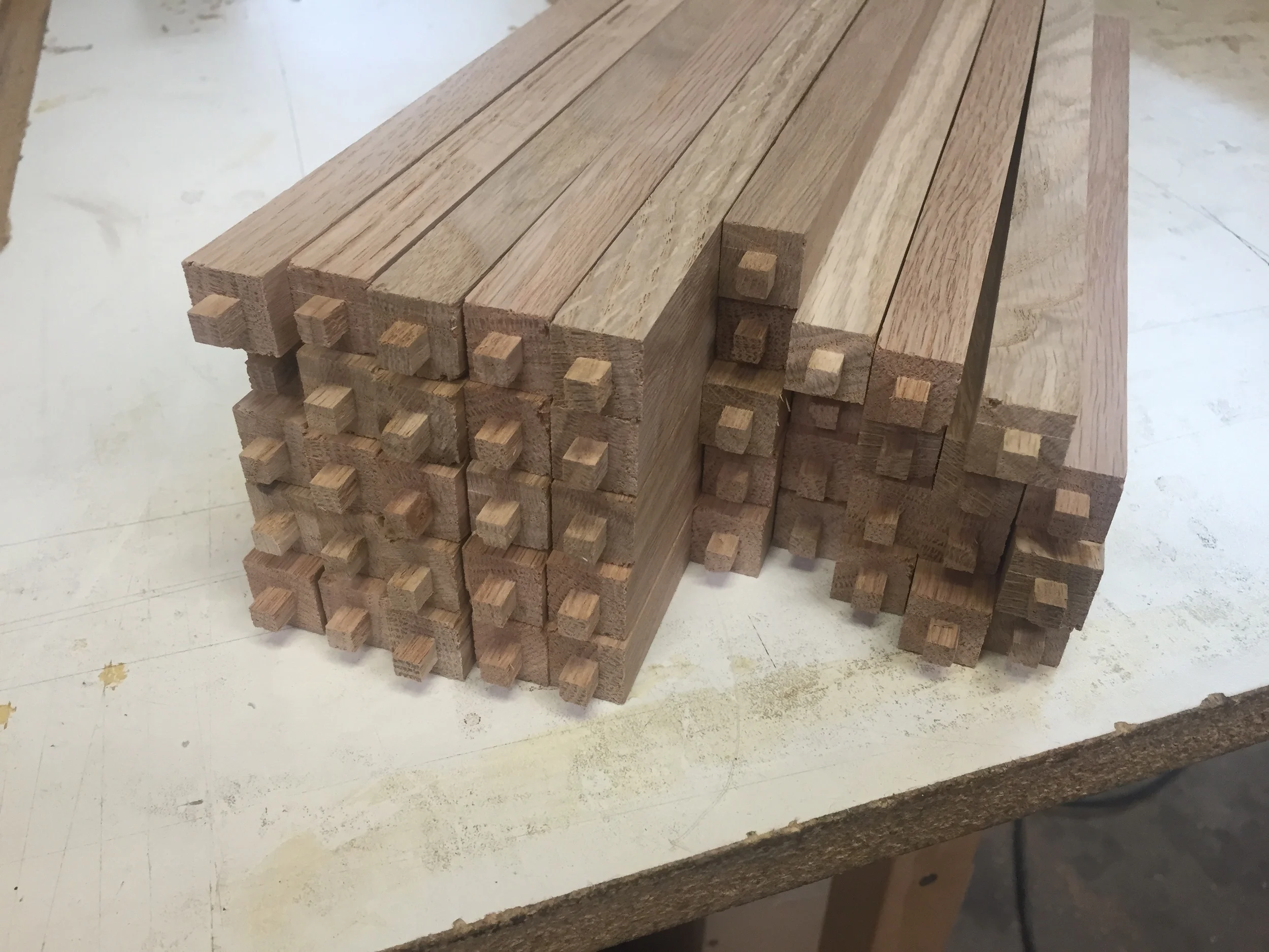 Now it was time to make all these things. Between the sofa and love seat, there were 206 12 1/2" long spindles, needing 412 mortise and tenon joints, with 824 faces. Each part needed to be jointed, planed, cut to length, have tenons cut, and each face hand planed. Later, they were sanded, had the grain raised, sanded again, had the dust removed, dyed, then shellacked. I spent a LOT of time processing those spindles.