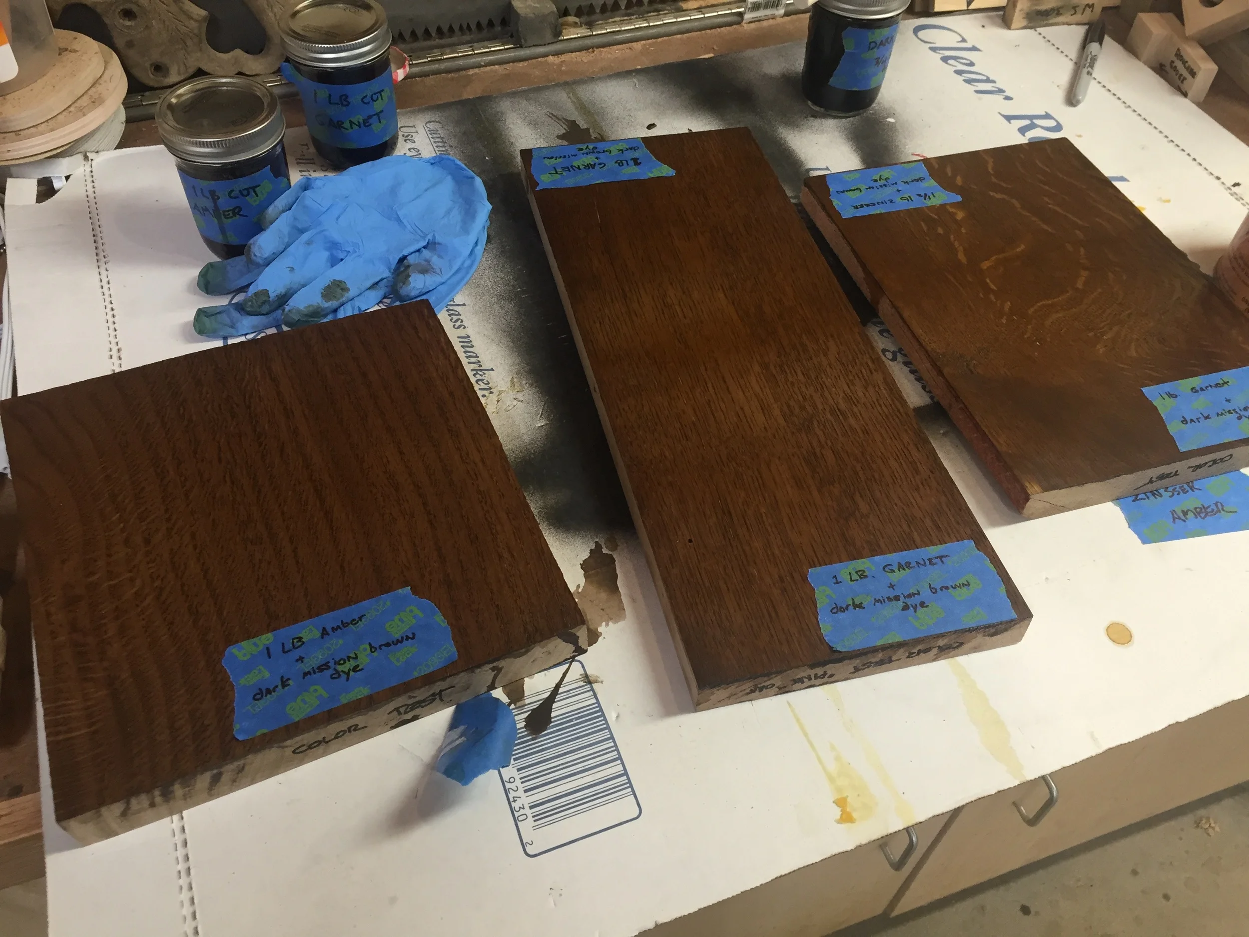This was as far as I could go without doing some pre-finishing. I made test boards to get the right balance of the dye and shellac, trying out a few different dye concentrations and types of shellac. I was going for a similar color/appearance to the mission pedestal table I did a couple of years ago. The final formula was full strength Transtint dark mission brown water based dye and several coats of dewaxed garnet shellac.