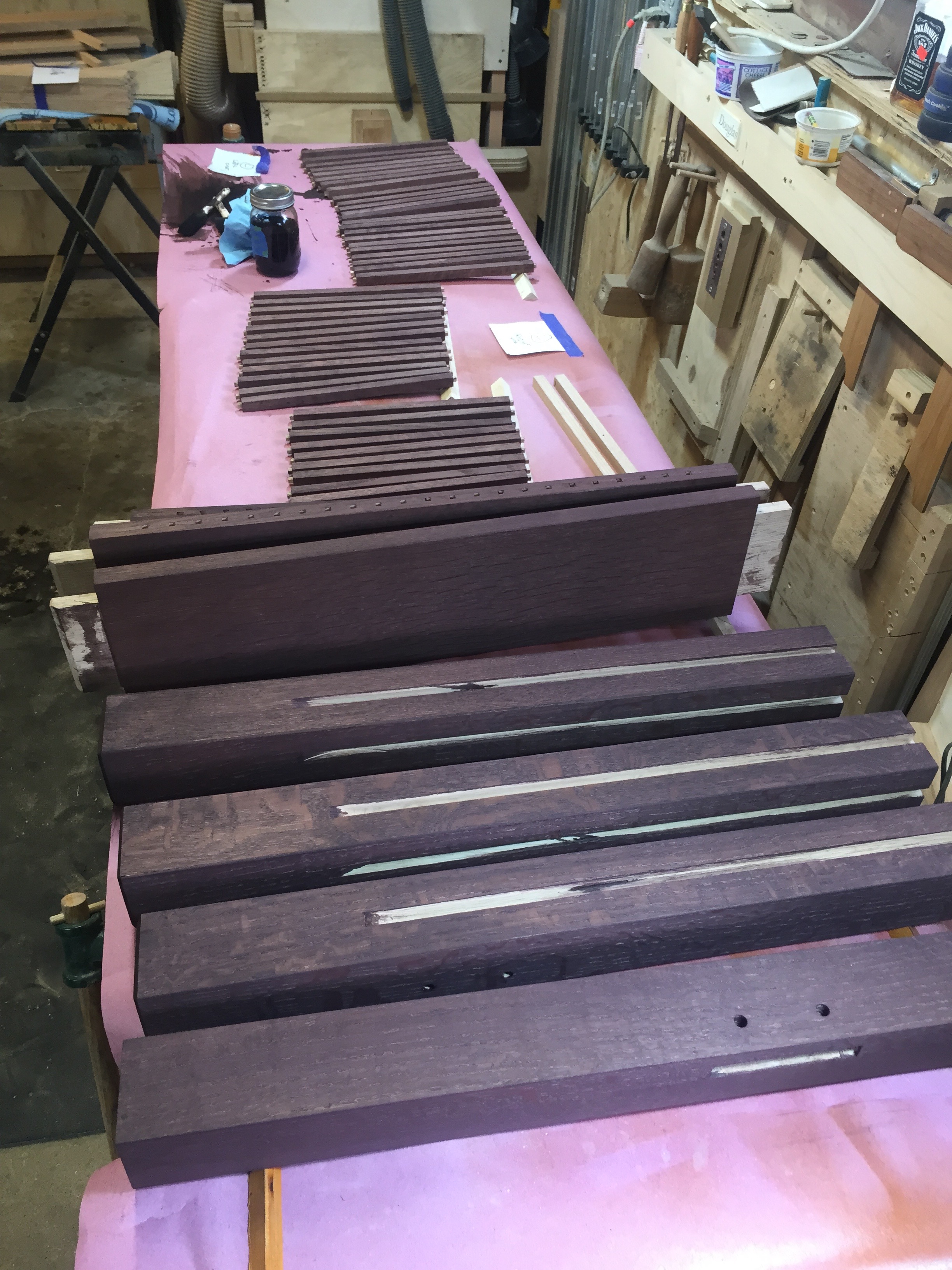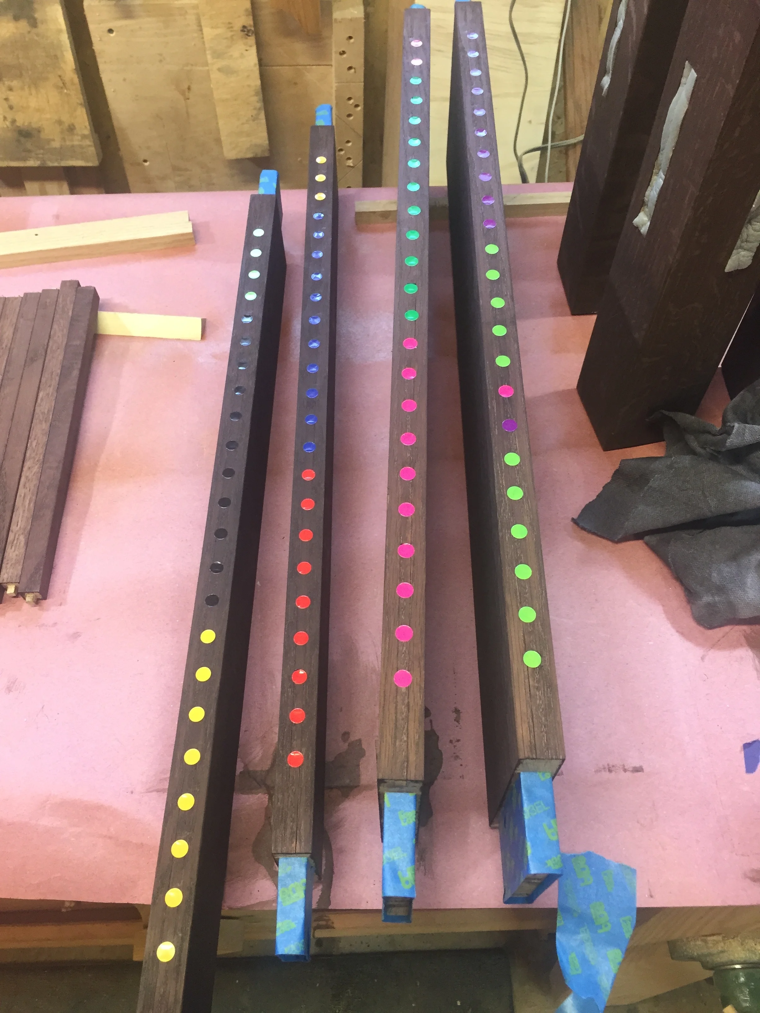I started the pre-finishing process, working the two sides of each piece together, then later doing the backs. That split the work into four roughly equal sized labors (love seat sides, love seat back, sofa sides, sofa back). Managing the spindles individually was troublesome, so I constructed a couple of racks that would support each spindle by its tenons, letting the faces be free to air dry during the various finished steps. This also made moving them around the shop easier.