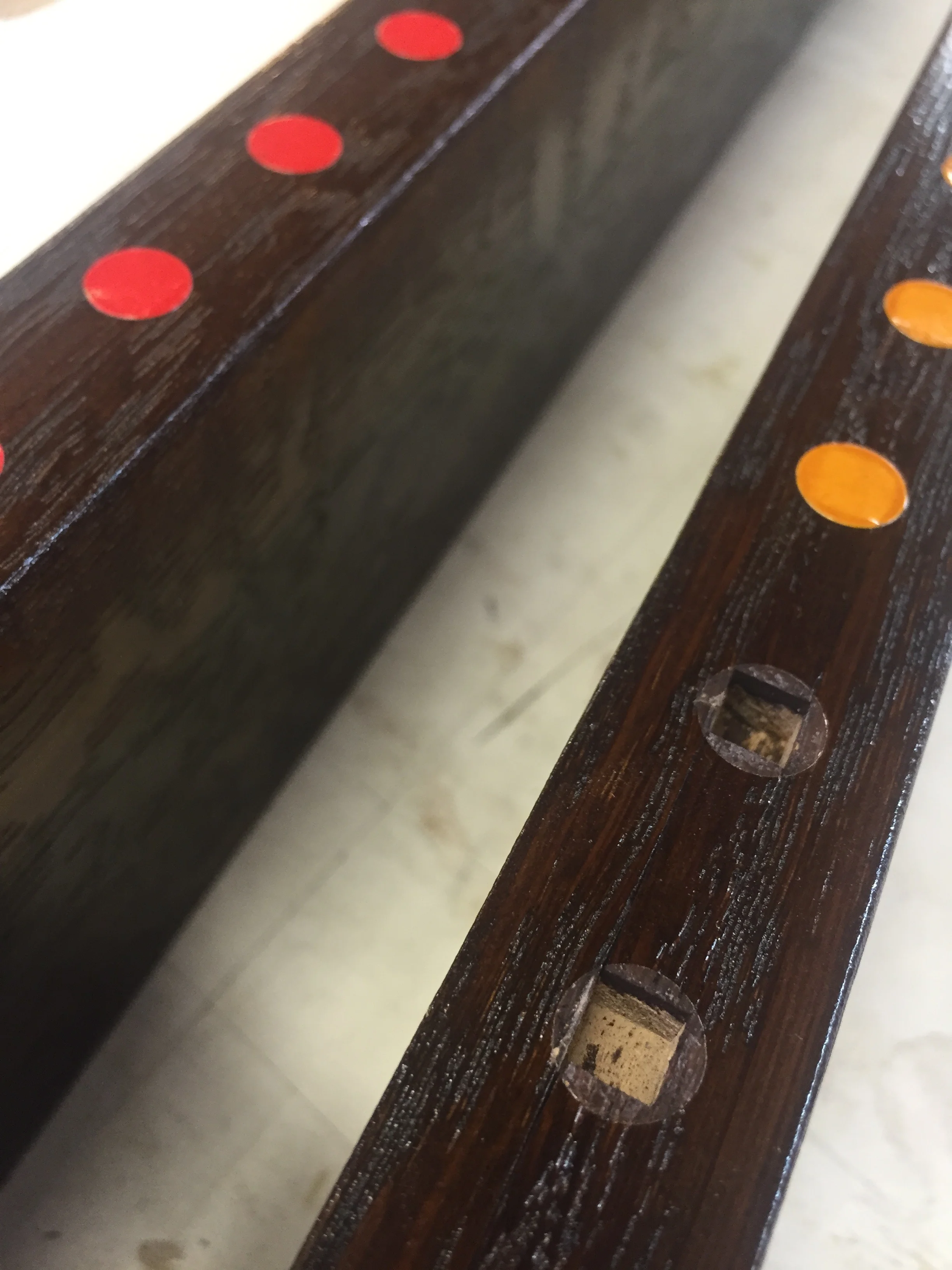 At first, I used little dot stickers to make sure I didn't get any shellac into the tiny mortises, but after testing it out, I realized this step wasn't needed, and stopped doing it for the rest of the process.