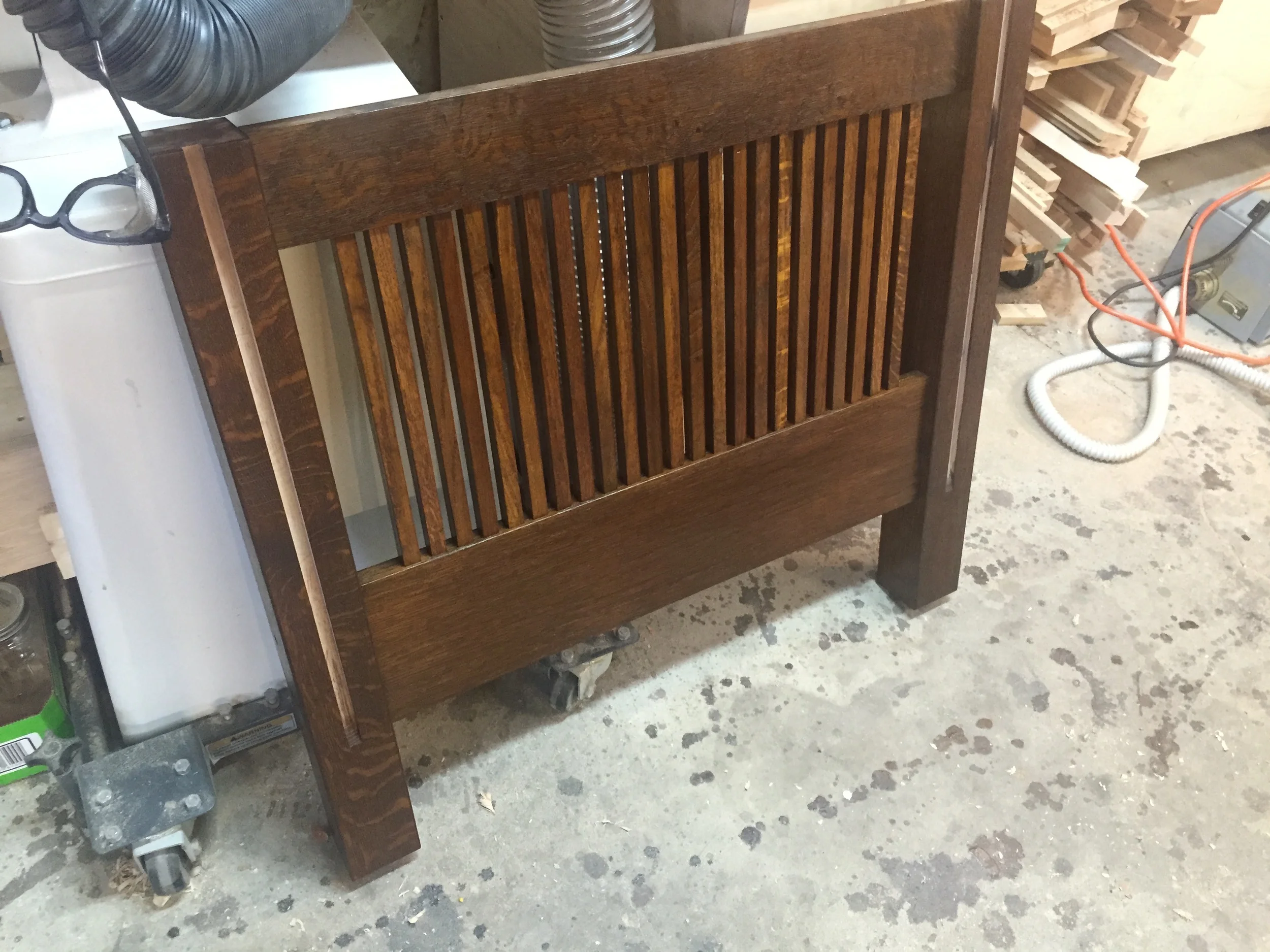 To see if the spindle design was feasible, I did a test build. The results were good, so I decided to go for it. The disadvantages of all the additional work and having to pre-finish were more than offset by not having to buy plywood. The design had begun to grow on me. I now had a good idea of how much extra work the spindles were (not as much as I'd feared), and I was able to settle on a good mortise and tenon size. In the test build, I toyed with adding a decorative center slat with a pierced design in it, but ended up ditching that idea, as I felt it was piling on too much decoration, and would take away from the other details of the pieces.
