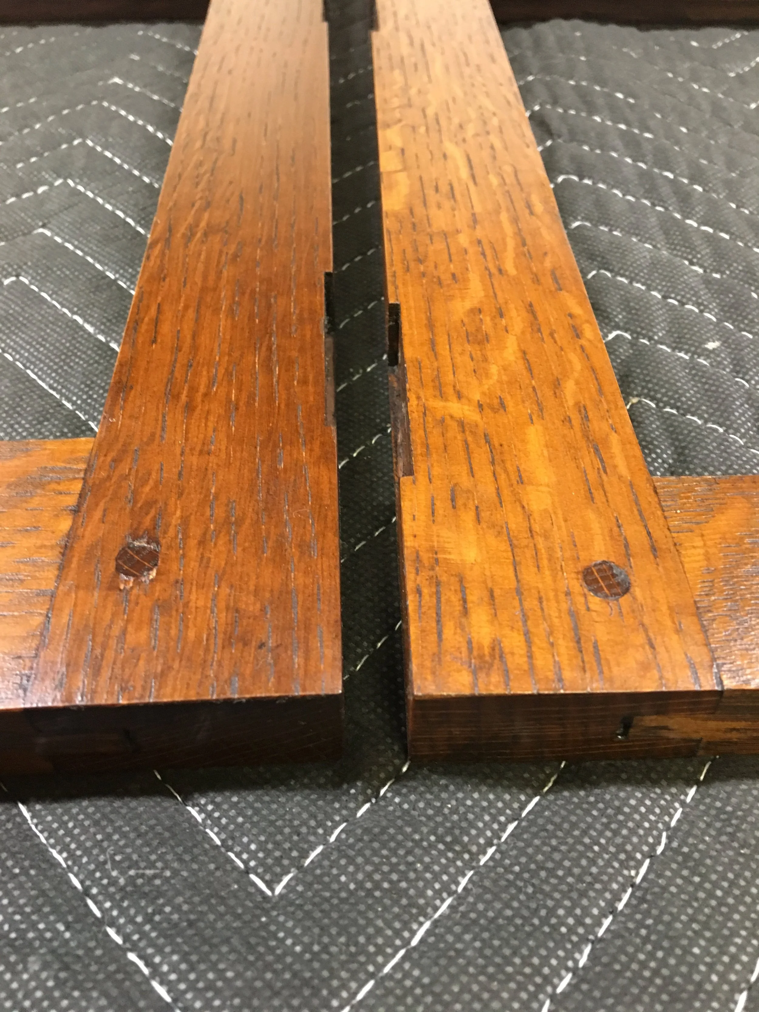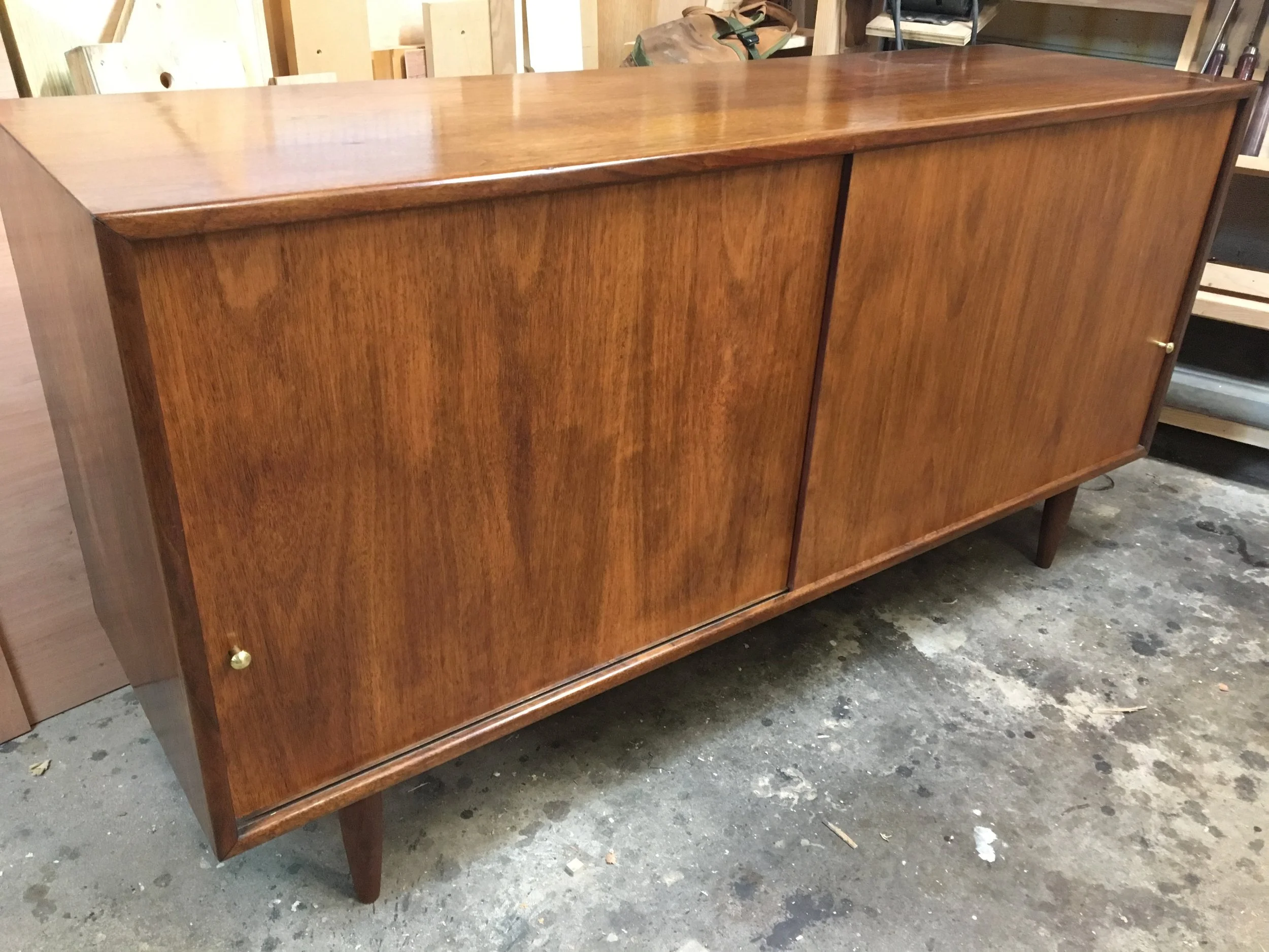 Applying paste wax to furniture is part of most furniture maker's process. For closed pore woods, such as cherry or maple, clear paste wax is usually used. But when finishing furniture made from open pored woods (oak, mahogany, walnut), it is a common practice to apply a colored paste wax as a final step. Usually a black or very dark brown wax. For the Arts & Crafts / Craftsman / Mission pieces I have built using quarter sawn white oak, I've done it on every piece. It is a standard part of my finishing regimen. Recently, I finished up a commission to replace some worn painted plywood doors on a mid-century modern credenza with mahogany veneer doors, and I used dark brown wax there as well. Let's look at the effect...