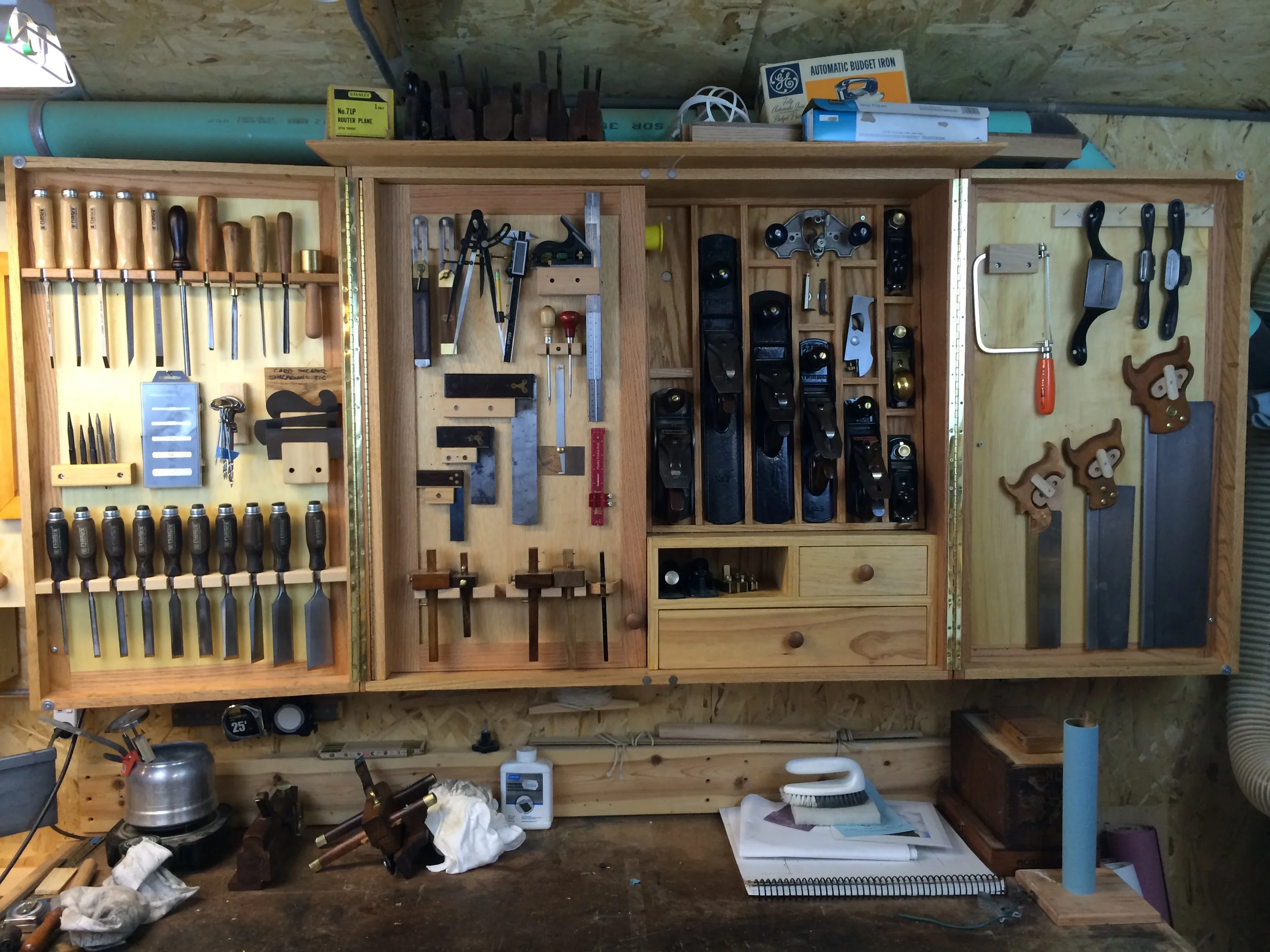 A couple of years ago, I got around to making a wall-hanging tool cabinet to store my hand tools. It was made from red oak, with birch plywood for the panels, and while not pretty, did a good job at holding my tools. The design came from the countless other wall hanging tool cabinets I'd seen posted here and there in the world of online woodworking, and I was pretty pleased with the result. Over the following months, I adjusted the tool holders, added more tools, moved other around, and fiddled with it until it became pretty full. More importantly, it became more useful, as I was more comfortable with where everything was stored, it was easy to reach for what I needed, sometimes without looking. It was also easy to know when I had forgotten to put a tool back into place.