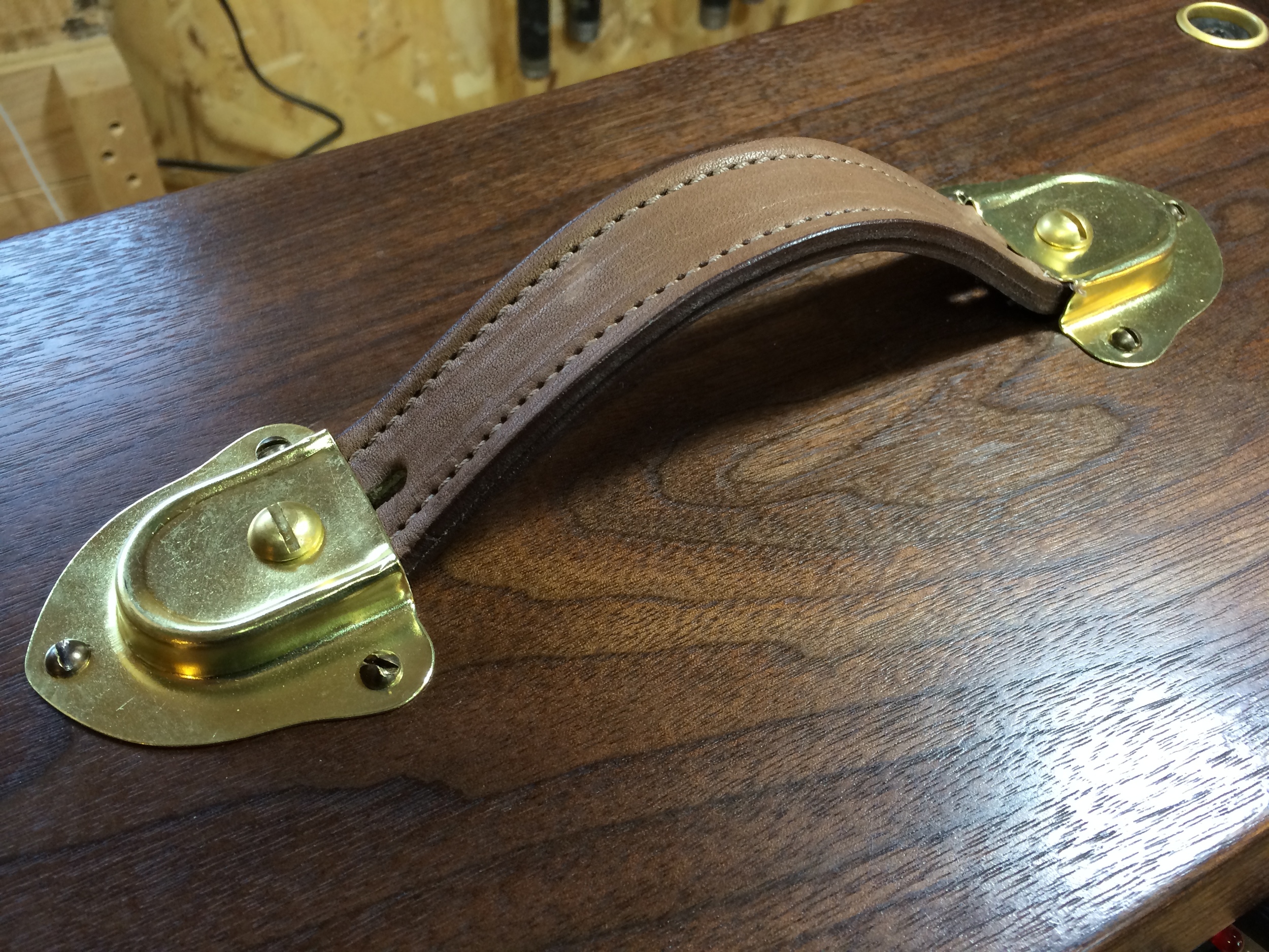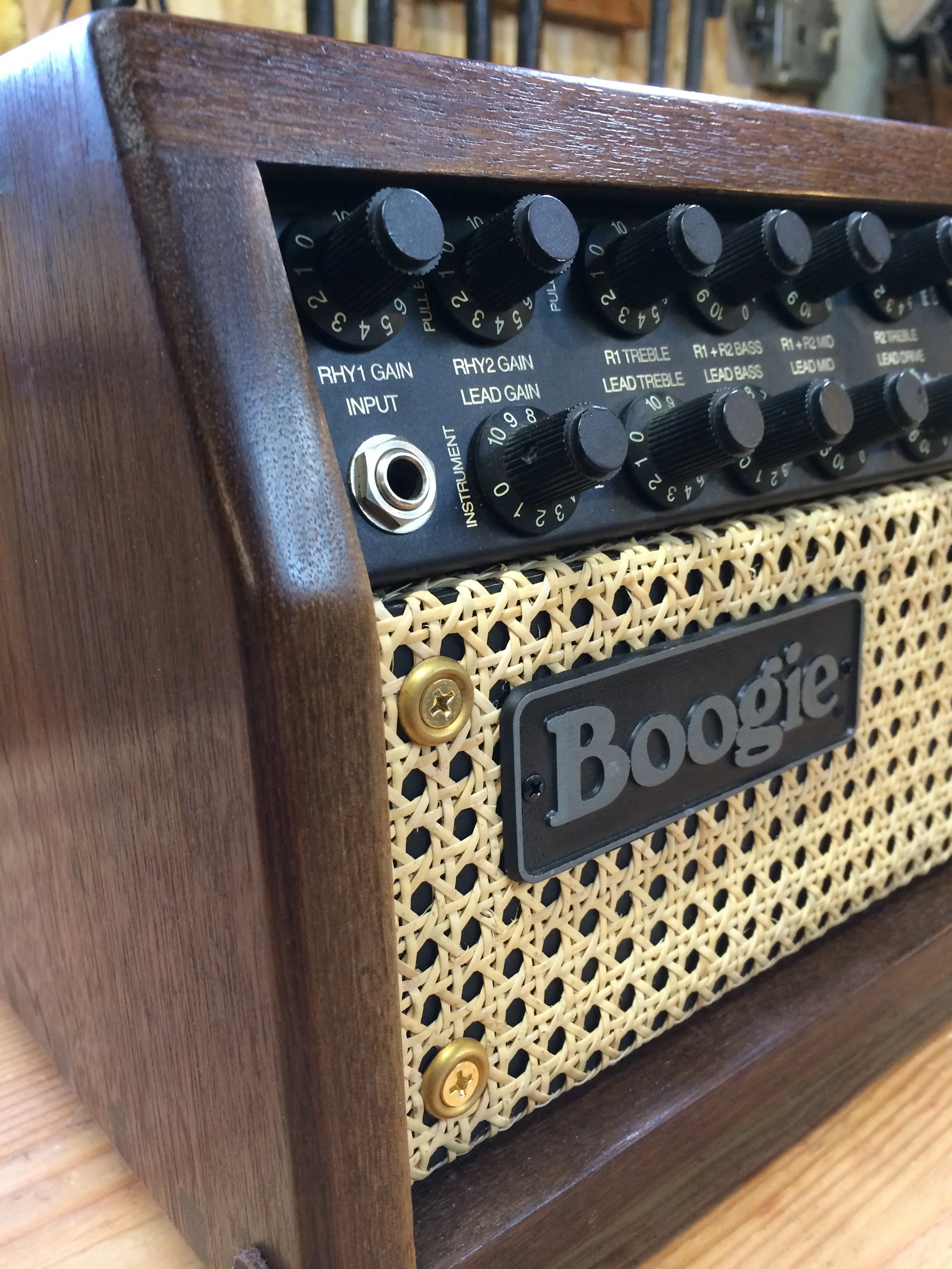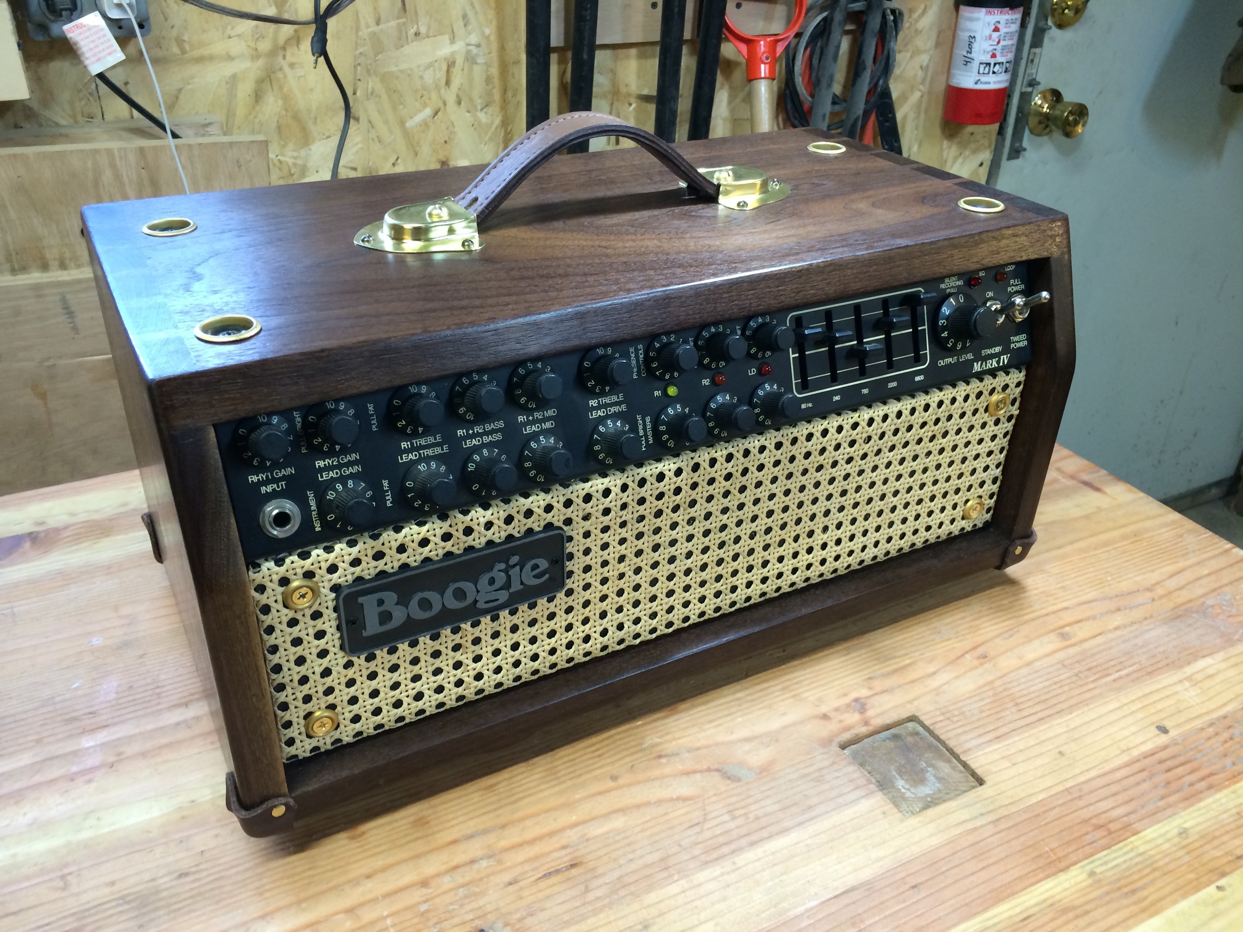 New enclosure and hardware for an '80s vintage Mesa Boogie Mark IV short chassis guitar head, built Dec 2013-January 2014. Made from walnut, and finished with oil, blonde shellac, and dark paste wax. It features hand cut dovetail joinery and brass hardware, with leather strap handle and corners.