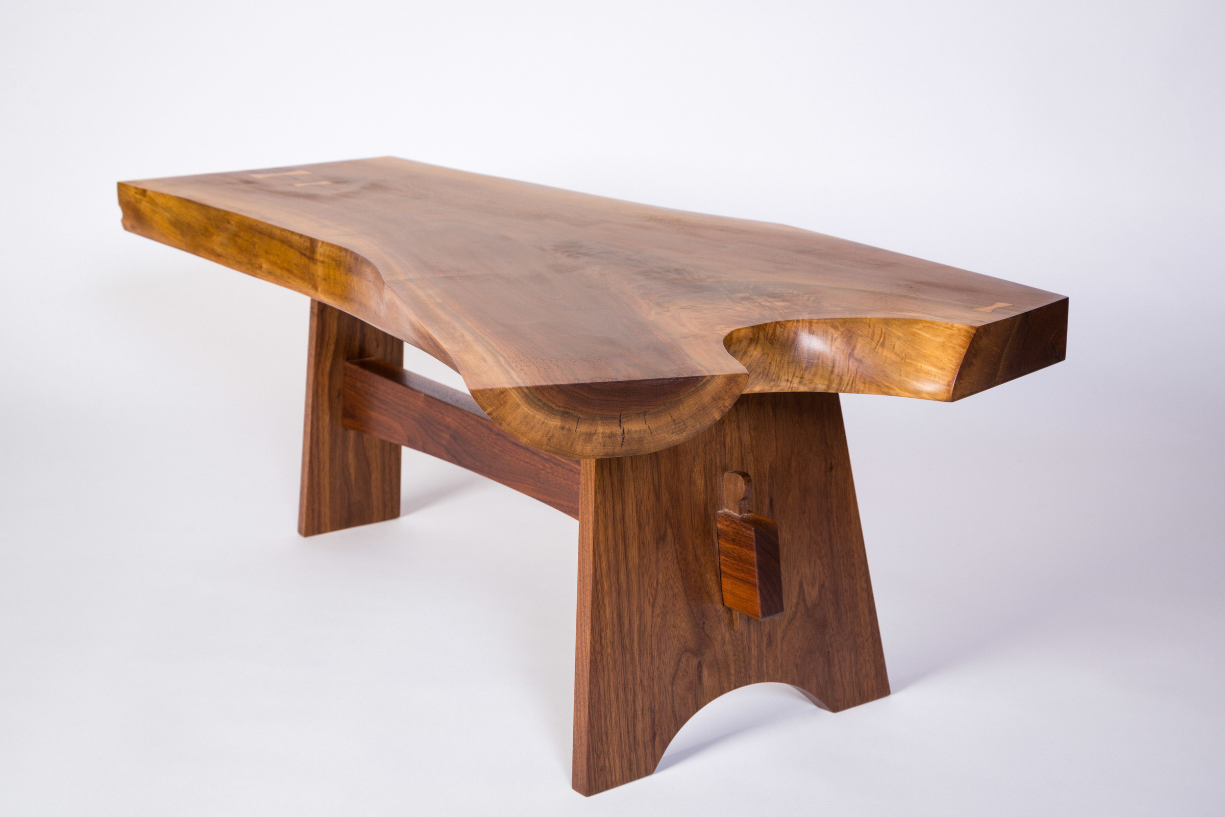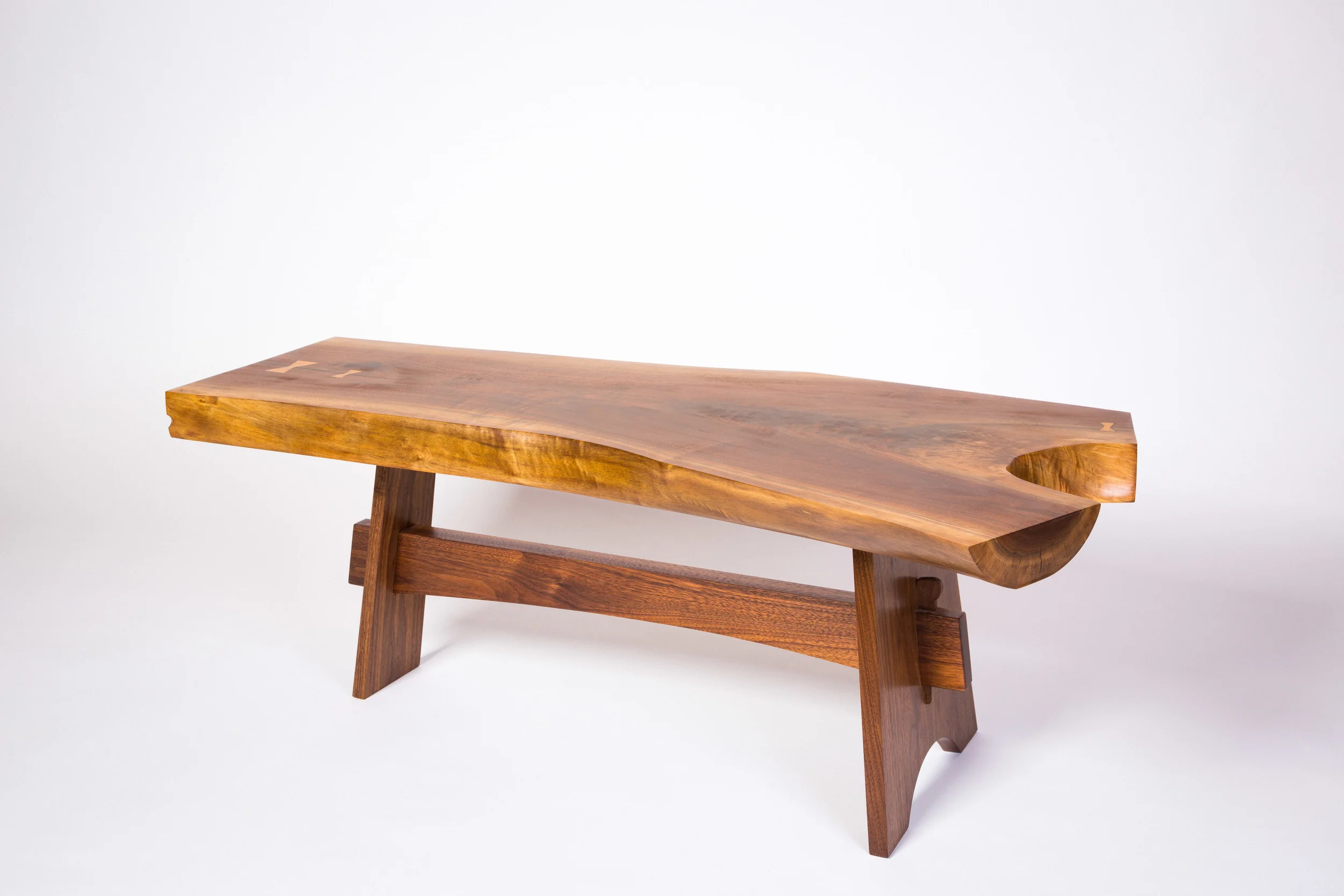 This coffee table was made from a nice piece of natural edge walnut crotch. I needed a small coffee table to accentuate our living room, but I wanted something that would offset the rectilinear forms of the prairie style sofa and loveseat I had build earlier in the year. This natural edge slab provided a great opportunity to add natural curves and form, and the checks or cracks allowed my to insert a few butterfly keys, first for structure, and secondarily for decoration. For the base, I wanted to connect the styles of traditional arts & crafts with the modern slab style, so I designed a three footed form that mirrored the crotch's "Y" shape, while adding some exposed joinery with the through tenons and wedges. All the wood is walnut, finished with an oil and varnish mix, except the butterfly keys, which are hard maple. The checks and cracks were filled with epoxy and dyed black.