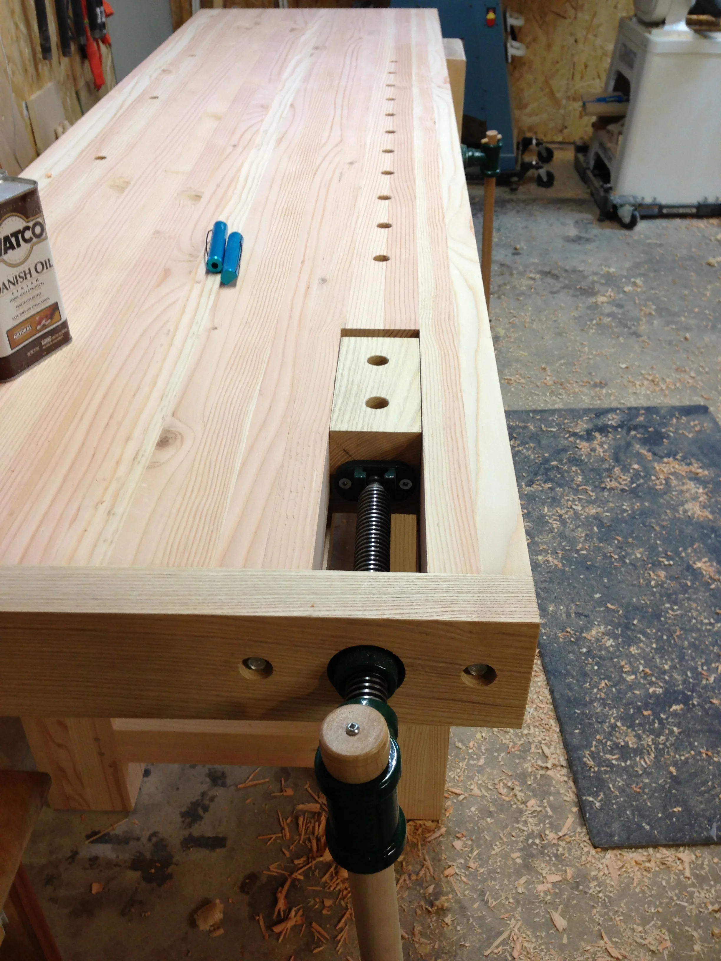 Built in the winter of 2012-2013. I needed to replace my old “weekend workbench” badly, and I built myself a Roubo from Douglas fir and ash. I detailed the build in this five part blog series at lumberjocks.com called “YAR! Yet Another Roubo” if you want to see scads of in progress photos.