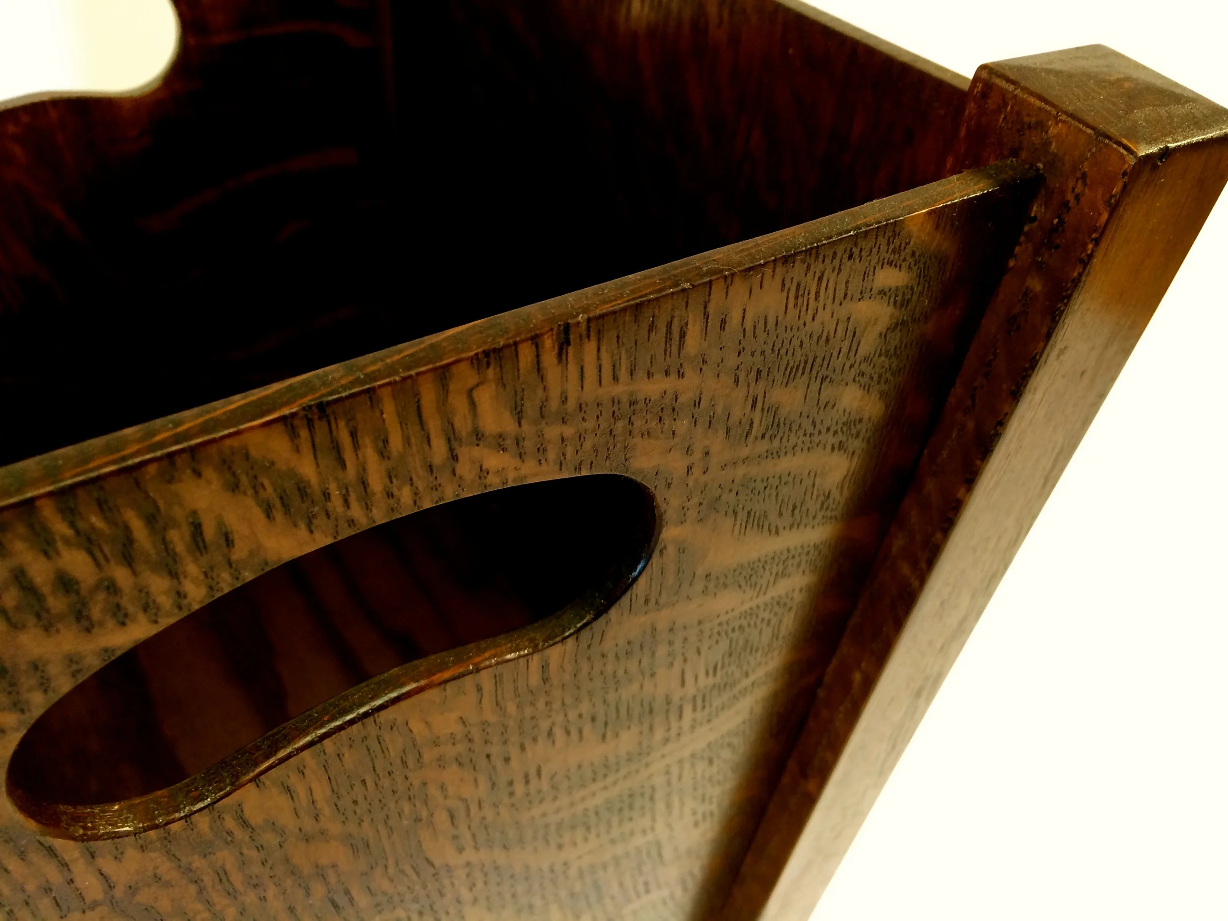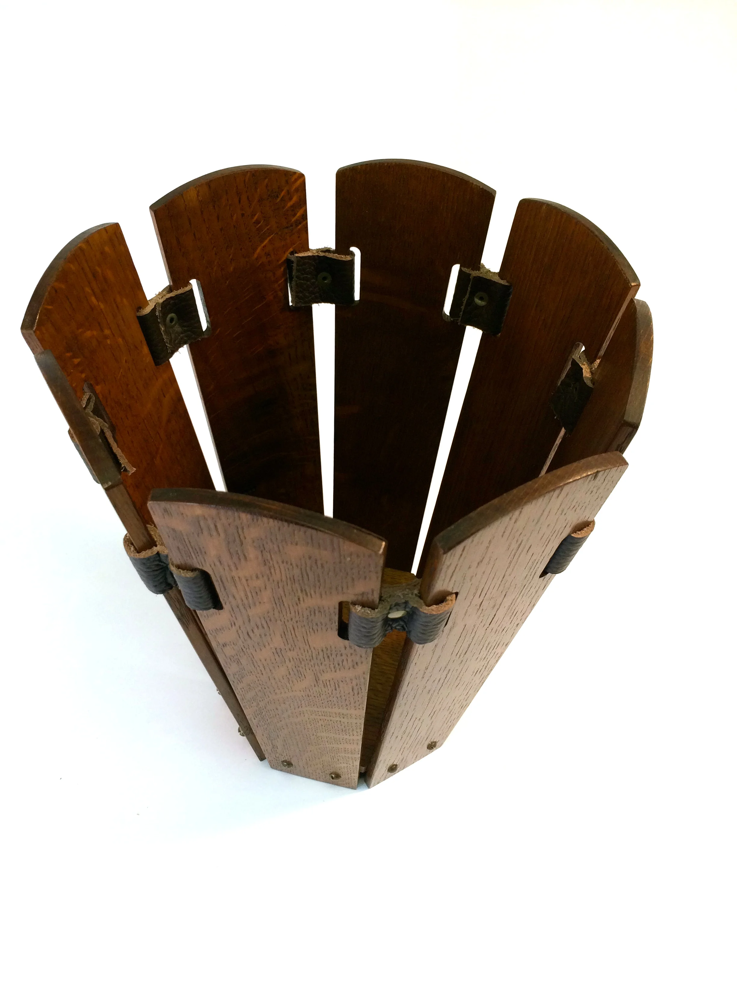 This is a set of four wastepaper baskets made from red and white oak, finished with tint dye, shellac, and dark paste wax. The "leaves" design comes in two variations, one with brass clips, and the other with leather loops. Completed in the spring of 2014.